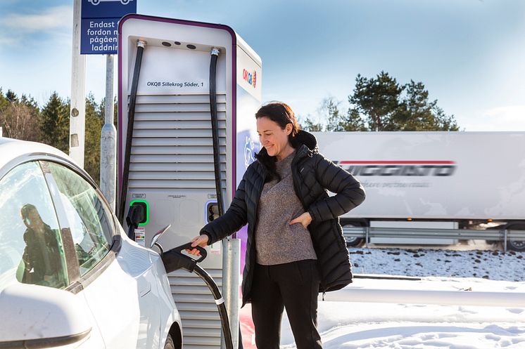 Jenny-Lo Markström laddar sin Tesla vid den nya supersnabbladdaren