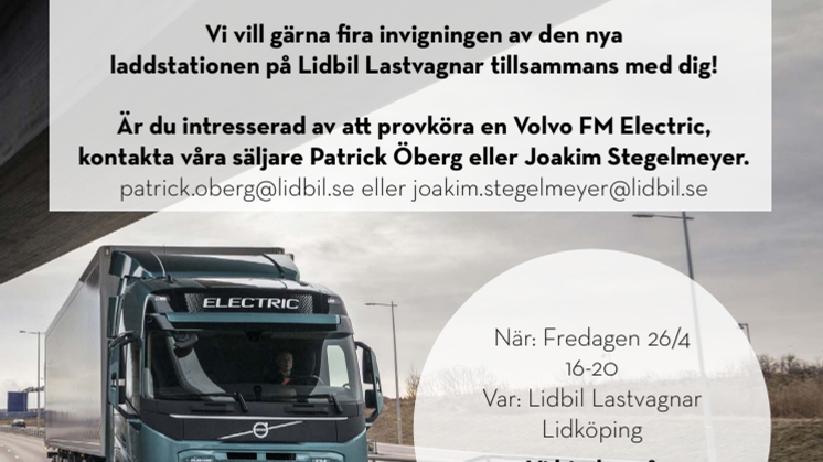 Invigning av den nya laddstationen kommer att ske hos Lidbil Lastvagnar på Björkhagsgatan den 26 april. Se bifogad pressinbjudan.