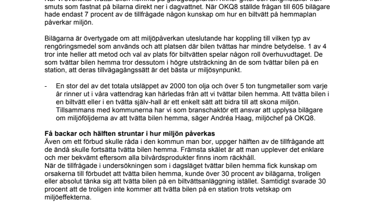 - En stor del av det totala utsläppet av 2000 ton olja och över 5 ton tungmetaller som varje år rinner ut i våra vattendrag kan härledas från att vi tvättar bilen hemma. Att tvätta bilen i en biltvätt eller i en tvätta själv-hall är ett enkelt sätt att bidra till att skona miljön. Tillsammans med kommunerna har vi som branschaktör ett ansvar att upplysa bilägare om miljöföljderna av att tvätta bilen hemma, säger Andréa Haag, miljöchef på OKQ8.
