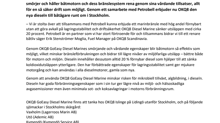 OKQ8 GoEasy Diesel Marine är en RME-fri diesel specialanpassad för båtmotorer. Dieseln smörjer och håller båtmotorn och dess bränslesystem rena genom sina vårdande tillsatser, allt för en så säker drift som möjligt. Genom ett samarbete med Petrobell erbjuder nu OKQ8 den nya dieseln till båtägare runt om i Stockholm.