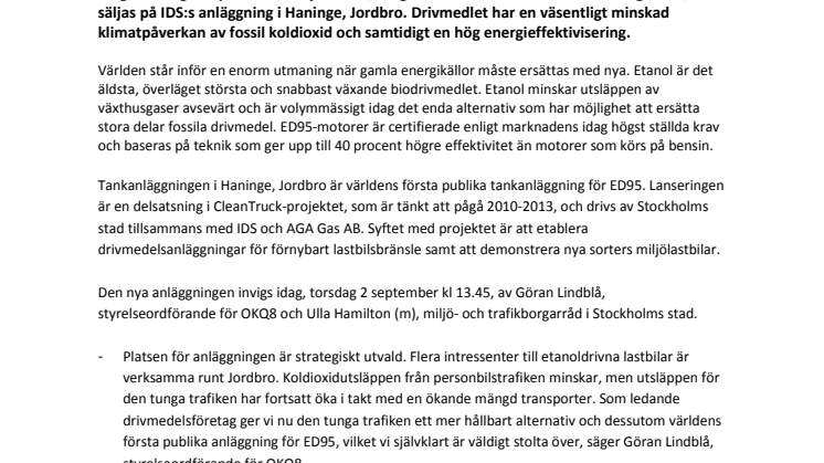 Tankanläggningen i Haninge, Jordbro är världens första publika tankanläggning för ED95. Lanseringen är en delsatsning i CleanTruck-projektet, som är tänkt att pågå 2010-2013, och drivs av Stockholms stad tillsammans med IDS och AGA Gas AB. Syftet med projektet är att etablera drivmedelsanläggningar för förnybart lastbilsbränsle samt att demonstrera nya sorters miljölastbilar.