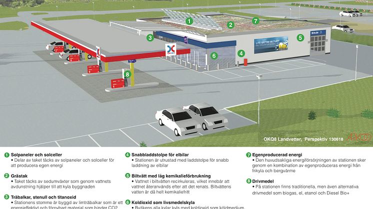 När OKQ8 öppnar Västsveriges första hållbara drivmedelsstation vid Landvetters nya handelsområde Airport City har stationen en konstruktion av trä, gräsbeklätt tak med solceller och snabbladdstolpe för elbilar. Den nya drivmedelsstationen, som förbrukar hälften så mycket energi som en traditionell station, invigs i dag av landshövdingen i Västra Götalands län och kommunstyrelsens ordförande