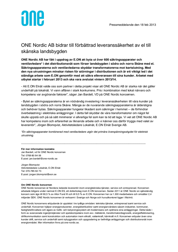 ONE Nordic AB har fått i uppdrag av E.ON att byta ut över 600 säkringsapparater och ventilavledare i det distributionsnät som förser landsbygden i södra och norra Skåne med el. Säkringsapparaterna och ventilavledarna skyddar transformatorerna mot kortslutning. Med den nya utrustningen minskar risken för störningar i distributionen.