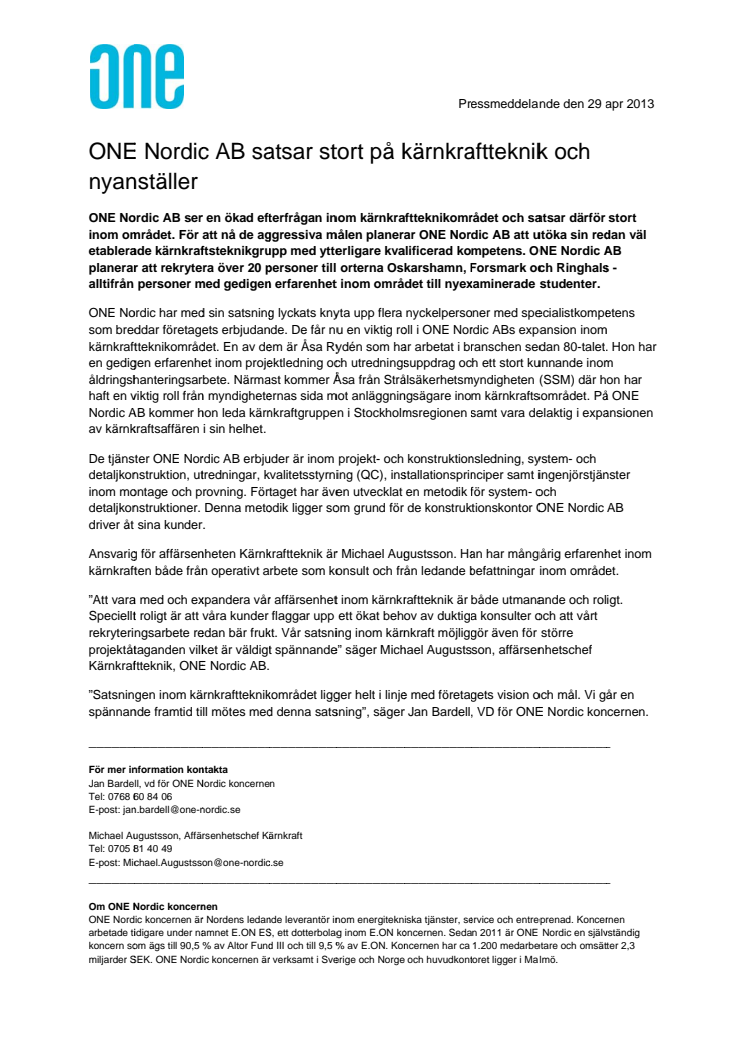 ONE Nordic AB ser en ökad efterfrågan inom kärnkraftteknikområdet och satsar därför stort inom området. ONE Nordic AB planerar att rekrytera över 20 personer till orterna Oskarshamn, Forsmark och Ringhals - alltifrån personer med gedigen erfarenhet inom området till nyexaminerade studenter.