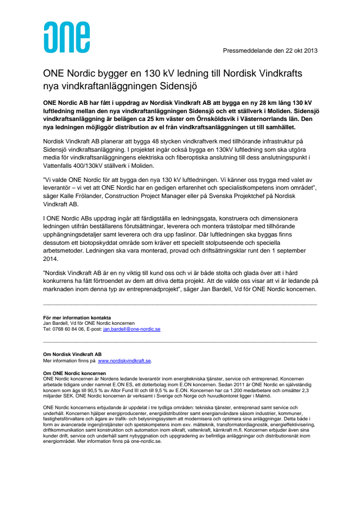 ONE Nordic AB har fått i uppdrag av Nordisk Vindkraft AB att bygga en ny 28 km lång 130 kV luftledning mellan den nya vindkraftanläggningen Sidensjö och ett ställverk i Moliden. Sidensjö vindkraftsanläggning är belägen ca 25 km väster om Örnsköldsvik i Västernorrlands län. Den nya ledningen möjliggör distribution av el från vindkraftsanläggningen ut till samhället.