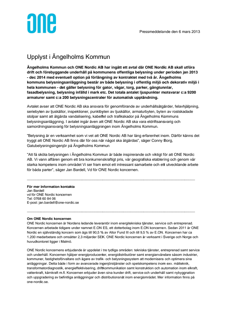 Ängelholms Kommun och ONE Nordic AB har ingått ett avtal där ONE Nordic AB skall utföra drift och förebyggande underhåll på kommunens offentliga belysning. Ängelholms kommuns belysningsanläggning består av både belysning i offentlig miljö och dekorativ miljö i hela kommunen. Det totala antalet ljuspunkter motsvarar ca 9200 armaturer samt c:a 200 belysningscentraler för automatisk upptändning.