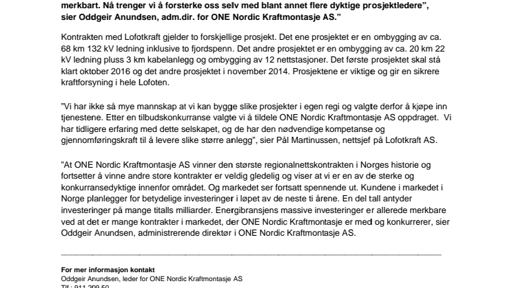 ONE Nordic koncernens norska dotterbolag ONE Nordic Kraftmontasje AS har skrivit kontrakt på två projekt för Lofotkraft AS på cirka 240 MNOK. Det är det största kontrakt som någonsin tecknats för byggnation av regionnät i norsk energihistoria. Utöver det har ONE Nordic Kraftmontasje AS även tecknat stora avtal med bl.a. BKK Nett AS, EB Nett AS och Statens Vegvesen. Totalt innebär det att den norska verksamheten nu har en orderreserv på närmare 400 MNOK.