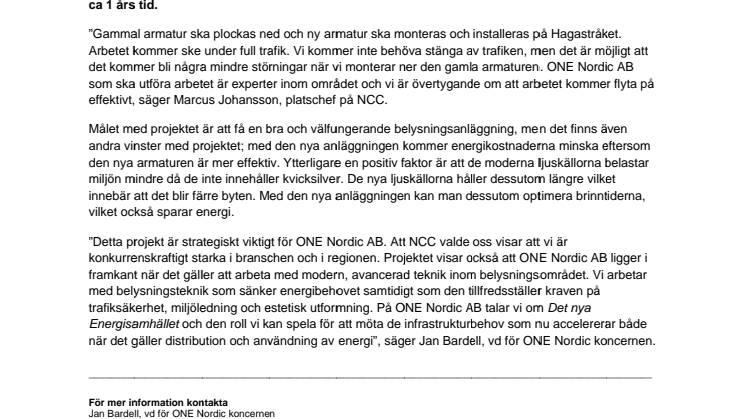 NCC ska bygga om Hagastråket i Göteborg genom att göra om en tvåfilig väg till en enfilig väg med ett fält för kollektivtrafik. Syftet är att underlätta för kollektivtrafiken. ONE Nordic ABs roll i projektet är dels att montera ned gammal befintlig belysning längs Hagastråket, dels att montera och installera en ny belysningsanläggning som är mer energieffektiv och miljöanpassad. Uppdragets omfattning beräknas till ca 1500 timmar och beräknas löpa under ca 1 års tid.
