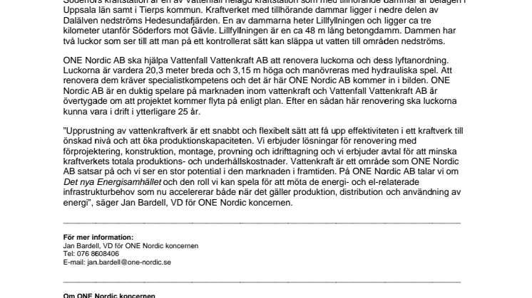 ”Upprustning av vattenkraftverk är ett snabbt och flexibelt sätt att få upp effektiviteten i ett kraftverk till önskad nivå och att öka produktionskapaciteten. Vi erbjuder lösningar för renovering med förprojektering, konstruktion, montage, provning och idrifttagning och vi erbjuder avtal för att minska kraftverkets totala produktions- och underhållskostnader. Vattenkraft är ett område som ONE Nordic AB satsar på och vi ser en stor potential i den marknaden i framtiden. På ONE Nordic AB talar vi om Det nya Energisamhället och den roll vi kan spela för att möta de energi- och el-relaterade infrastrukturbehov som nu accelererar både när det gäller produktion, distribution och användning av energi”, säger Jan Bardell, VD för ONE Nordic koncernen.