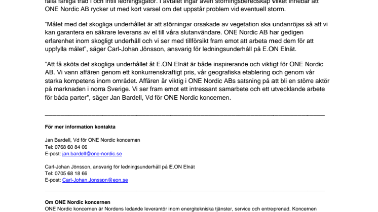 ”Att få sköta det skogliga underhållet åt E.ON Elnät är både inspirerande och viktigt för ONE Nordic AB. Vi vann affären genom ett konkurrenskraftigt pris, vår geografiska etablering och genom vår starka kompetens inom området. Affären är viktig i ONE Nordic ABs satsning på att bli en större aktör på marknaden i norra Sverige. Vi ser fram emot ett intressant samarbete och ett utvecklande arbete för båda parter", säger Jan Bardell, Vd för ONE Nordic koncernen.