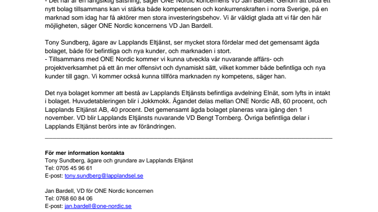 ONE Nordic AB och Lapplands Eltjänst AB har för avsikt att bilda ett nytt gemensamt ägt bolag med fokus på drift- och underhållstjänster och lokalnätsprojekt i norra Sverige. Målet är att expandera och skapa nya arbetstillfällen i Norrbottens län som idag har stora investeringsbehov i infrastruktur, gruvnäring och vindkraft. Ambitionen är att nyanställa mellan 15 till 25 medarbetare inom något år.