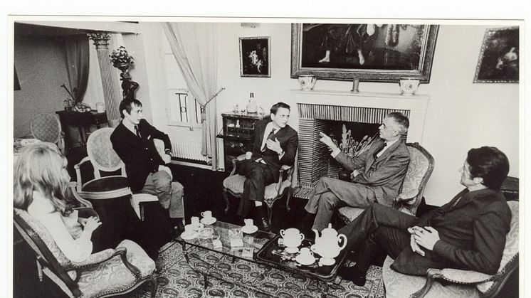 Men här ser ni bilden av oss då vi drack kaffe i salongen. Mitterrand hade gått, kvar var Olof Palme, L. Roland Dumas, och en fransk professor, Maurice Duverger. Och jag då.