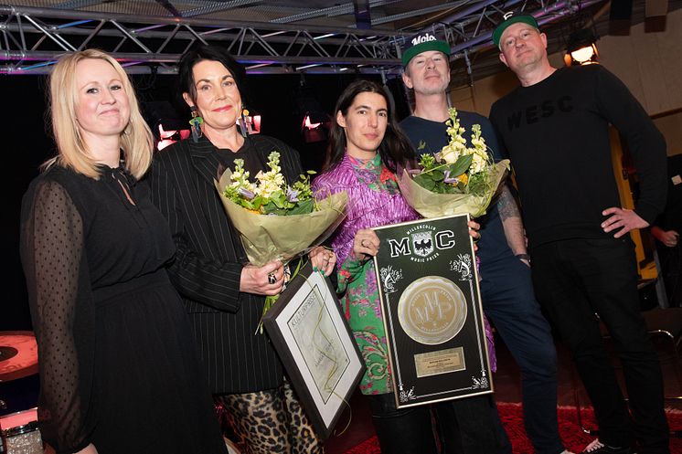 Utdelning av Kulturpriset till Hjalmar Bergmans minne och Millencolin Music Prize 2023 på Kulturkvarteret i Örebro den 7 mars 2024. Från vänster i bild: prisutdelare Madelene Spinord Semenets (S), ordförande Kultur- och fritidsnämnden, pristagarna Maria Sveland (vinnare Kulturpriset) och Mariam Wallentin (vinnare Millencolin Music Prize) samt Mathias Färm och Erik Ohlsson från Millencolin.