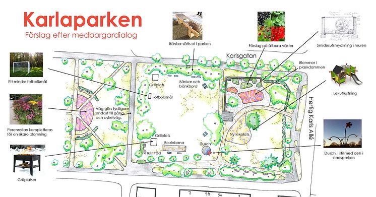 Illustration med bilder som visar hur det kommer bli i Karlaparken.