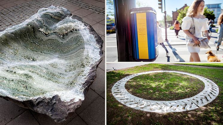 Kollage som visar de tre konstverk som Örebro kommun köper in från Open Art 2022: Tresamhet, konstnär Jelena Rundqvist. Musical Crosswalk, konstnär Håkan Lidbo. Ichnotechno (machines that leave traces), konstnär Sidsel Bonde.