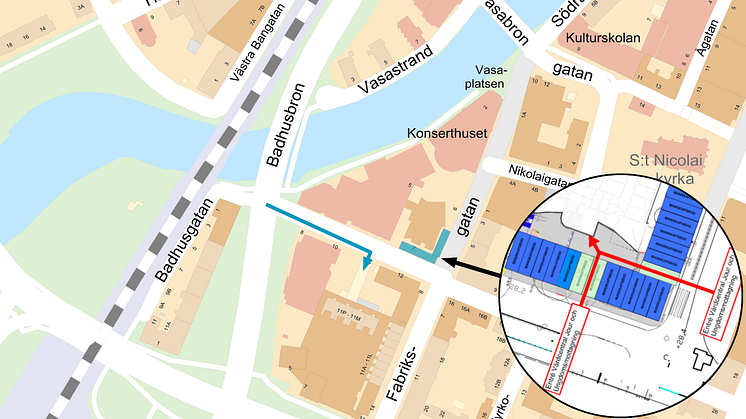 I hörnet av Nygatan/Fabriksgatan kommer det att stå bodar, men man kan ta sig till Jourvårdcentralen och Ungdomsmottagningen genom öppningar under bodarna (se kartan).