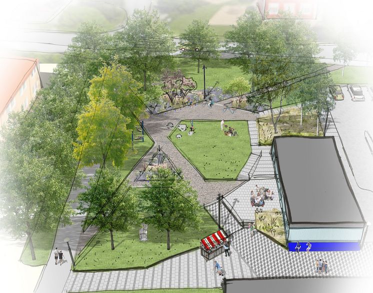 Torget behåller sin gröna karaktär och ramas in av träd och fasader. Bättre insyn och överblickbarhet kommer att skapas. Belysningen på torget kommer att bytas ut, för att besökare ska känna sig trygga. Det byggs en diagonal gångbana som sträcker sig från ICA-entrén över torget mot passagen över Gamla Arbogavägen. Torget kommer att erbjuda ett antal olika sociala ytor för att flera olika aktiviteter ska kunna pågå samtidigt.