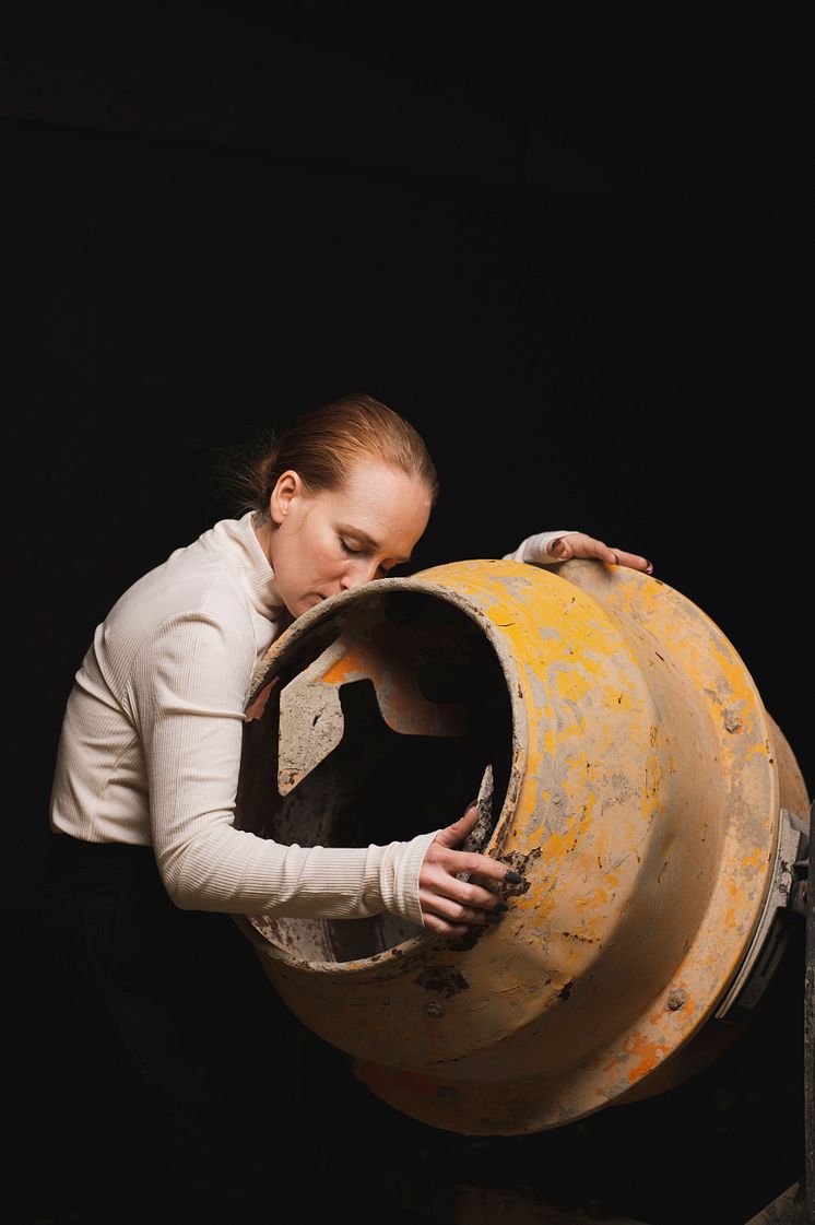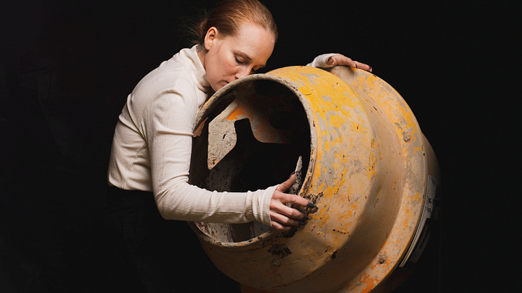 – Arbetet med Blomsterkiosken var ett känslomässigt högriskprojekt från start. Min mamma och jag hade brutit kontakten helt med varandra. Men så en dag sträckte hon ut ett litet prövande finger. Hon hade släktforskat och upptäckt att vi är släkt med arkitekten Sigurd Lewerentz. Det här kom så oväntat. I vår familj var det arbetarklass så långt ögat nådde. Att en världsberömd arkitekt fanns i släkten blev en otippad start på en omtumlande relationell resa. Ingen av oss visste hur den skulle sluta. För att inte riva upp gamla sår och inte backa ur, så var det tvunget att bli ett konstprojekt. Jag kontaktade konstnären och arkitekten Petra Gipp och kompositör Foad Arbabi, båda såklart med en vurm för betong och brutalism. Och här är vi nu, säger Lisen Rosell som på scenen får sällskap av en betongblandare och en stor skulptur signerad Petra Gipp.