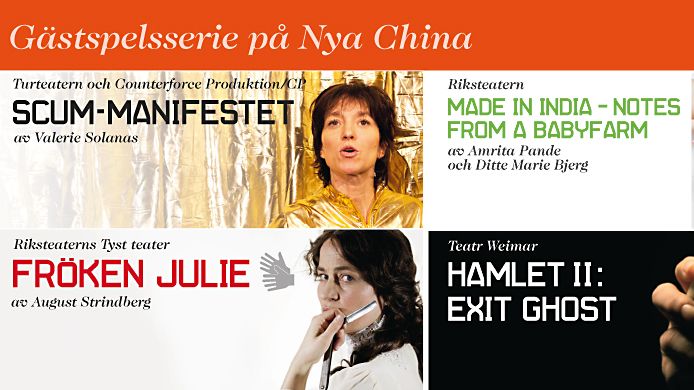 Den 16 oktober startar säsongens gästspelsserie på Nya China. Under hösten 2012 och våren 2013 gästar fyra produktioner som bjuder på högkvalitativ och oväntad scenkonst Nya China. Gästspelsserien inleds 16 oktober när Turteatern/Counterforce Producion CP ger den omskrivna och kritikerrosade dramatieringen av Valerie Solanas SCUM-manifestet.