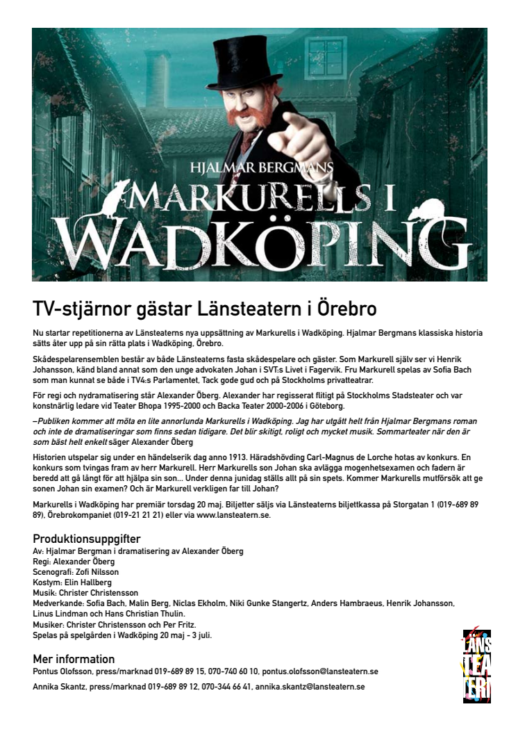 Markurells i Wadköping har premiär torsdag 20 maj. Biljetter säljs via Länsteaterns biljettkassa på Storgatan 1 (019-689 89 89), Örebrokompaniet (019-21 21 21) eller via www.lansteatern.se.