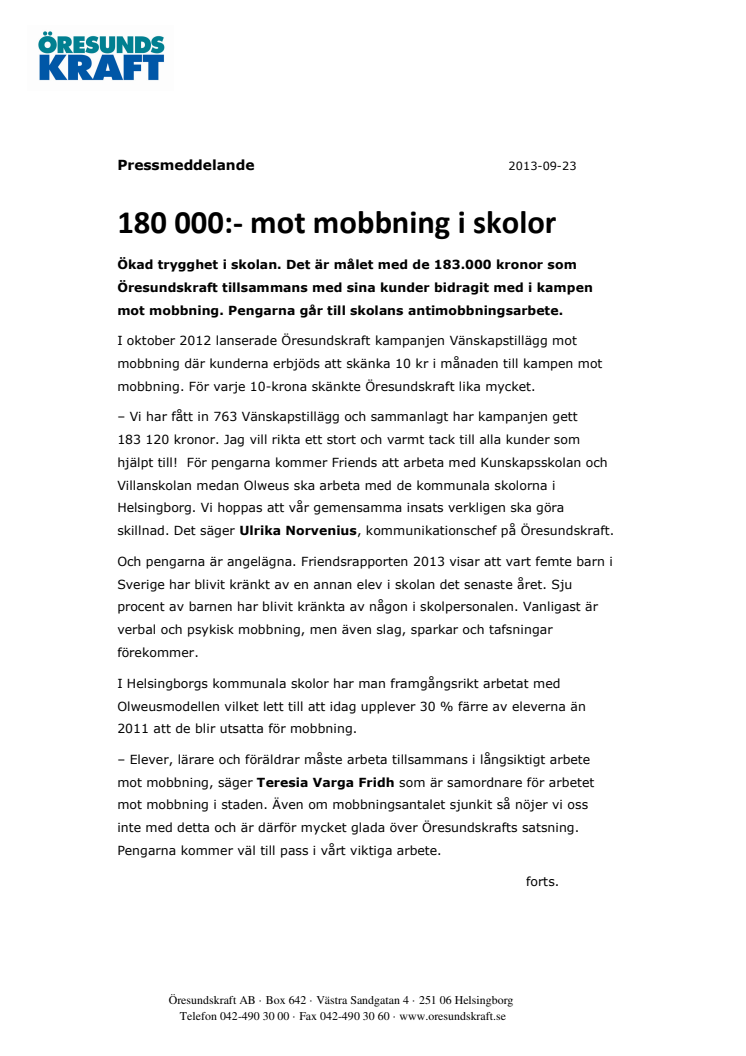 763 vänskapstillägg och 183.000 kronor i arbetet mot mobbning. Det blev resultatet av Öresundskrafts kampanj Vänskapstillägg mot mobbning. Pengarna går till Friends och Olweus antimobbningsprogram i Helsingborgs-regionen.