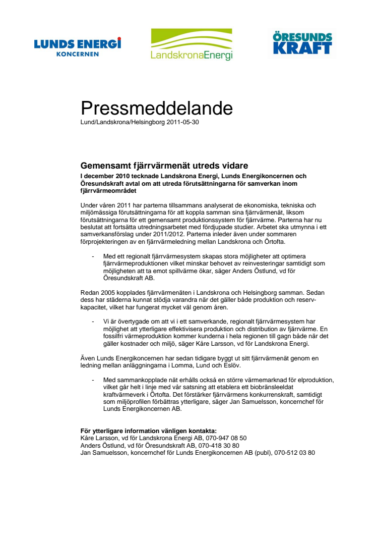 Landskrona Energi, Lunds Energikoncernen och Öresundskraft förlänger avtal om att utreda förutsättningarna för samverkan inom fjärrvärmeområdet.