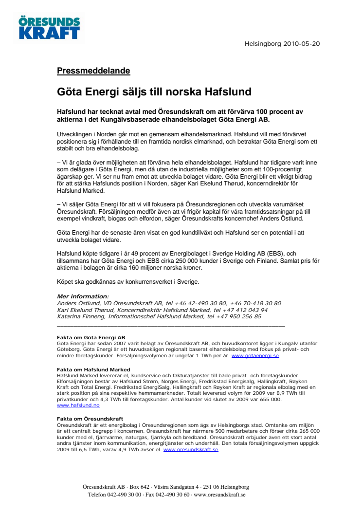 Hafslund har tecknat avtal med Öresundskraft om att förvärva 100 procent av aktierna i det Kungälvsbaserade elhandelsbolaget Göta Energi AB.