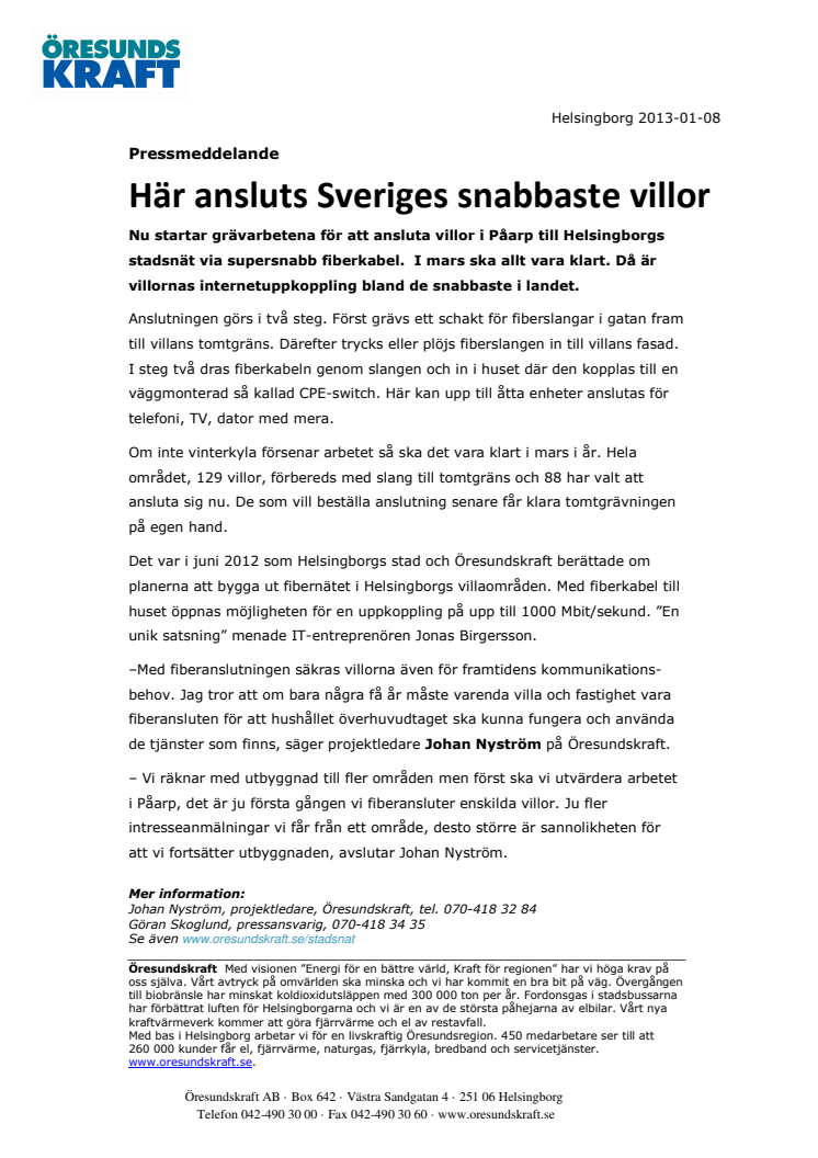 Nu dras fiberkabel rakt in i ett antal villor i Påarp utanför Helsingborg. Resultatet blir en blixtrande snabb bredbandsuppkoppling och helt nya möjligheter att ta del av den digitala världens växande utbud.