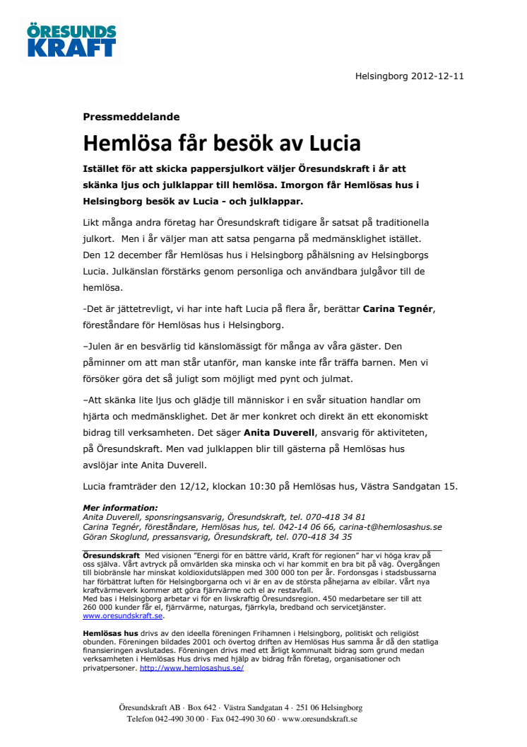 Lucia och julklappar till Hemlösas hus i Helsingborg. Öresundskraft väljer medmänsklighet framför pappersjulkort i år.