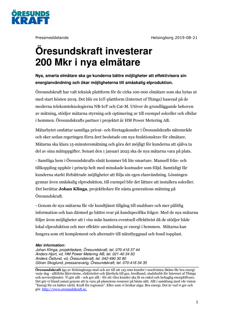 Öresundskraft investerar 200 Mkr i nya elmätare
