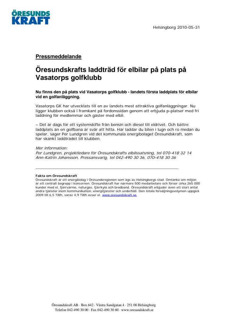 Öresundskrafts laddträd för elbilar på plats på Vasatorps golfklubb