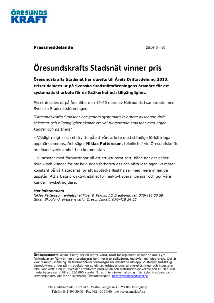 Öresundskrafts Stadsnät har fått priset för Årets Driftavdelning 2013 för ett systematiskt arbete för driftsäkerhet och tillgänglighet.