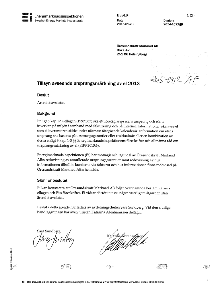 Energimarknadsinspektionen konstaterar att Öresundskraft lever upp till lagen om att ange elens ursprung och elens inverkan på miljön.