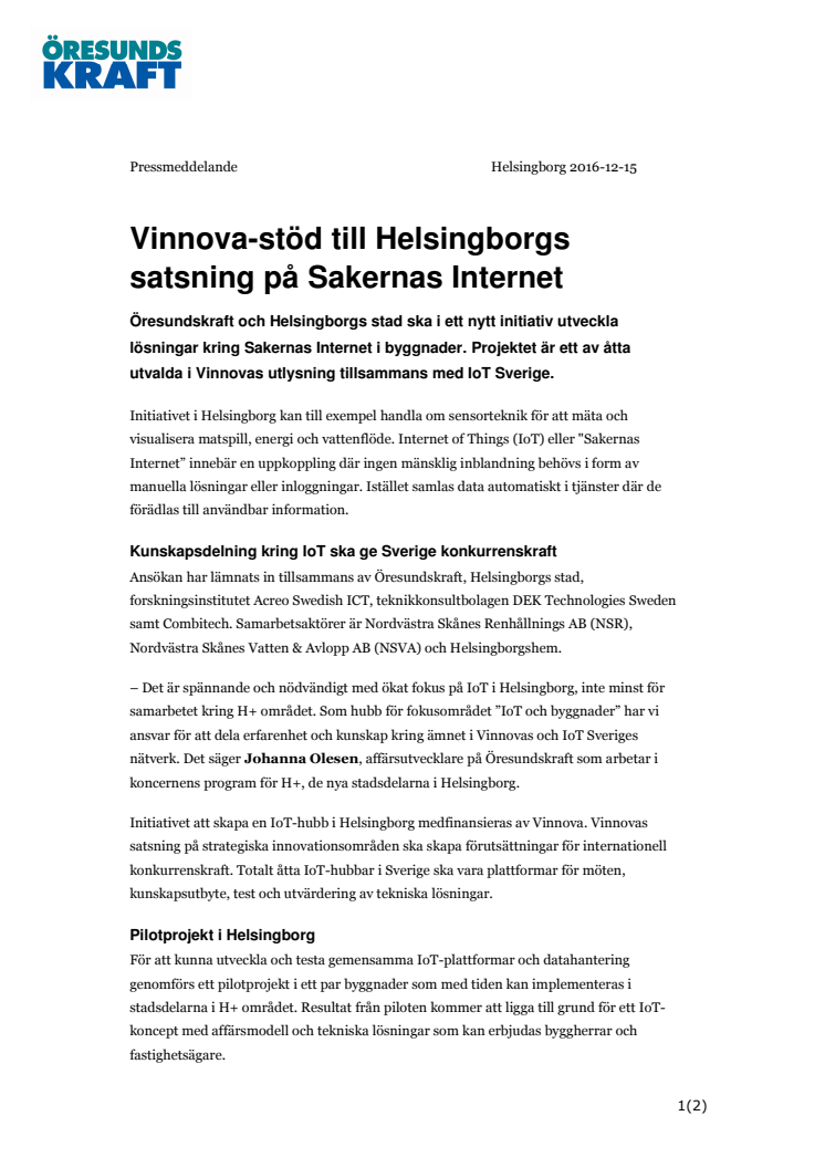 Vinnova-stöd till Helsingborgs satsning på Sakernas Internet