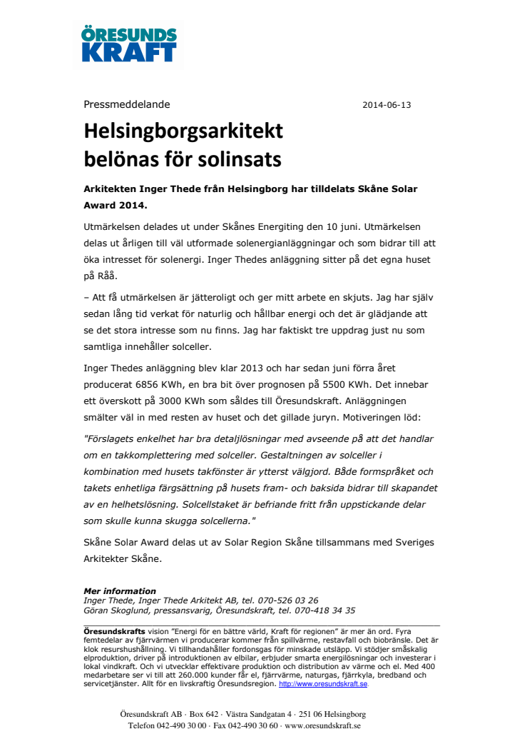 Skåne Solar Award 2014 till arkitekt Inger Thede