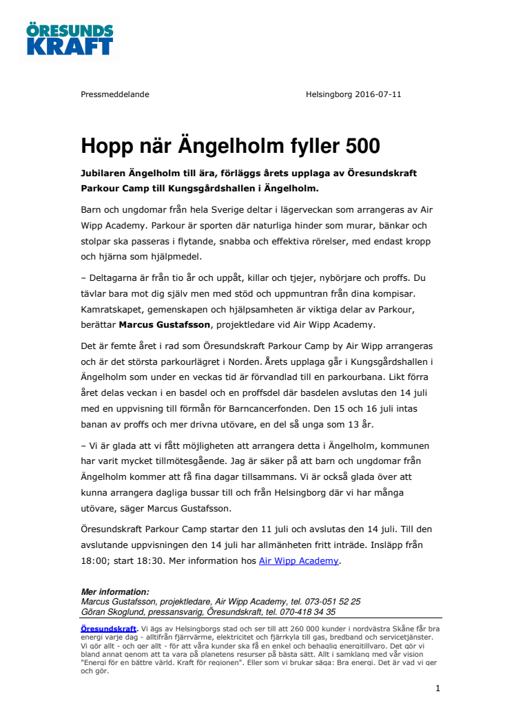 Jubilaren Ängelholm till ära förläggs årets upplaga av Öresundskraft Parkour Camp till Kungsgårdshallen i Ängelholm.