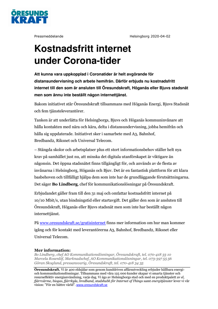 – Stängda skolor och arbetsplatser plus ett stort informationsbehov ställer helt nya krav på samhället just nu, att minska det digitala utanförskapet är viktigare än någonsin. Det öppna stadsnätet finns tillgängligt för, och används av de flesta av invånarna i Helsingborg, Höganäs och Bjuv. Det är en fantastisk plattform för att klara basbehoven och tillfälligt hjälpa dem som inte har de grundläggande förutsättningarna. Det säger Bo Lindberg, chef för kommunikationslösningar på Öresundskraft.