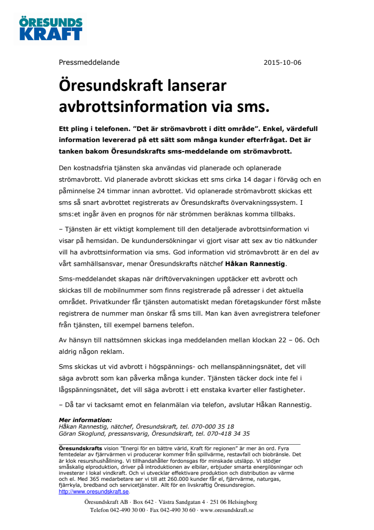 – Tjänsten är ett viktigt komplement till den detaljerade avbrottsinformation vi visar på hemsidan. De kundundersökningar vi gjort visar att sex av tio nätkunder vill ha avbrottsinformation via sms. God information vid strömavbrott är en del av vårt samhällsansvar, menar Öresundskrafts nätchef Håkan Rannestig.