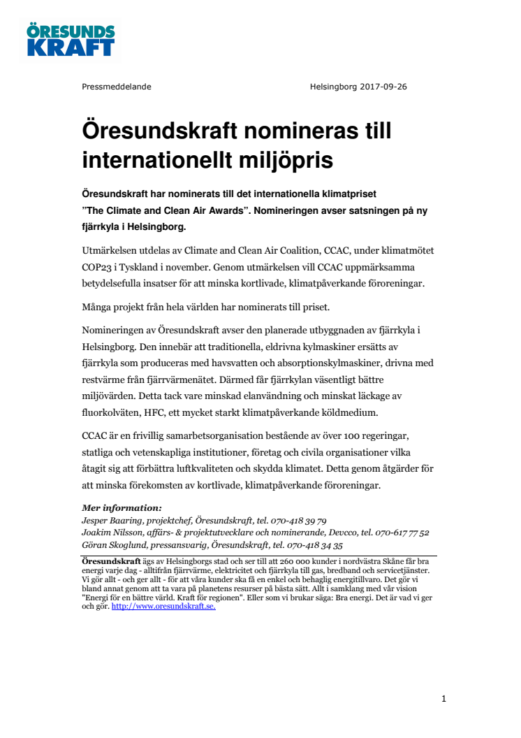 Öresundskraft har nominerats till det internationella klimatpriset ”The Climate and Clean Air Awards”. Nomineringen avser satsningen på ny fjärrkyla i Helsingborg.