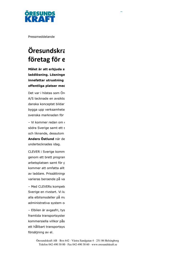 Det var i höstas som Öresundskraft och den danska elbilsspecialisten CLEVER A/S tecknade en avsiktsförklaring om samarbete. Baserat på det framgångrika danska konceptet bildar Öresundskraft nu ett svenskt företag för att snabbt bygga upp verksamheten och etablera en ledande position på den växande, svenska marknaden för elbilsladdning.