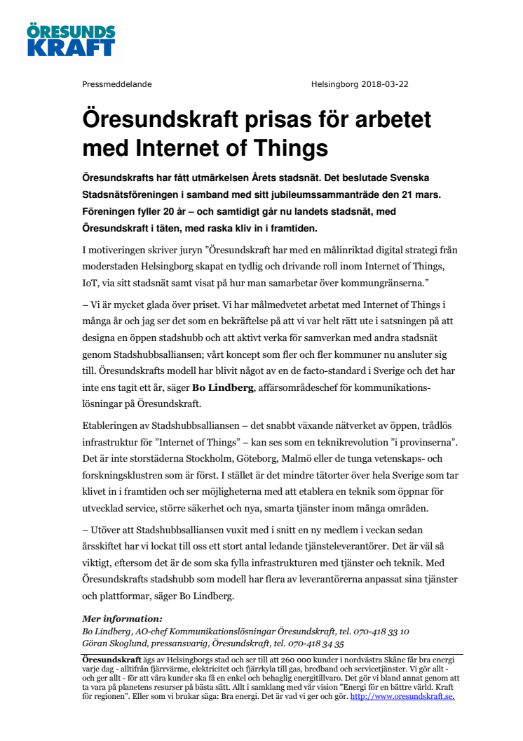 – Vi är mycket glada över priset. Vi har målmedvetet arbetat med Internet of Things i många år och jag ser det som en bekräftelse på att vi var helt rätt ute i satsningen på att designa en öppen stadshubb och att aktivt verka för samverkan med andra stadsnät genom att starta Stadshubbsalliansen; vårt koncept som fler och fler kommuner nu ansluter sig till. Öresundskrafts modell har blivit något av en de facto-standard i Sverige och det har inte ens tagit ett år, säger Bo Lindberg, affärsområdeschef för kommunikationslösningar på Öresundskraft.
