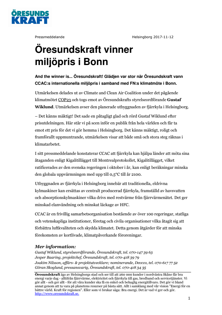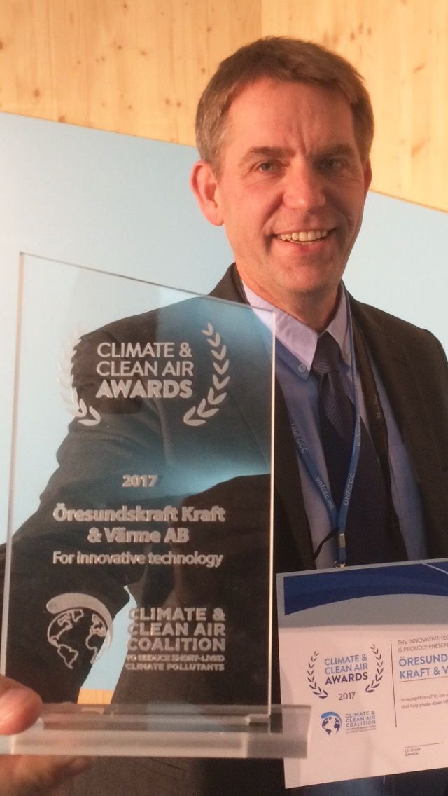 Utmärkelsen delades ut av Climate and Clean Air Coalition under det pågående klimatmötet COP23 och togs emot av Öresundskrafts styrelseordförande Gustaf Wiklund. Utmärkelsen avser den planerade utbyggnaden av fjärrkyla i Helsingborg.