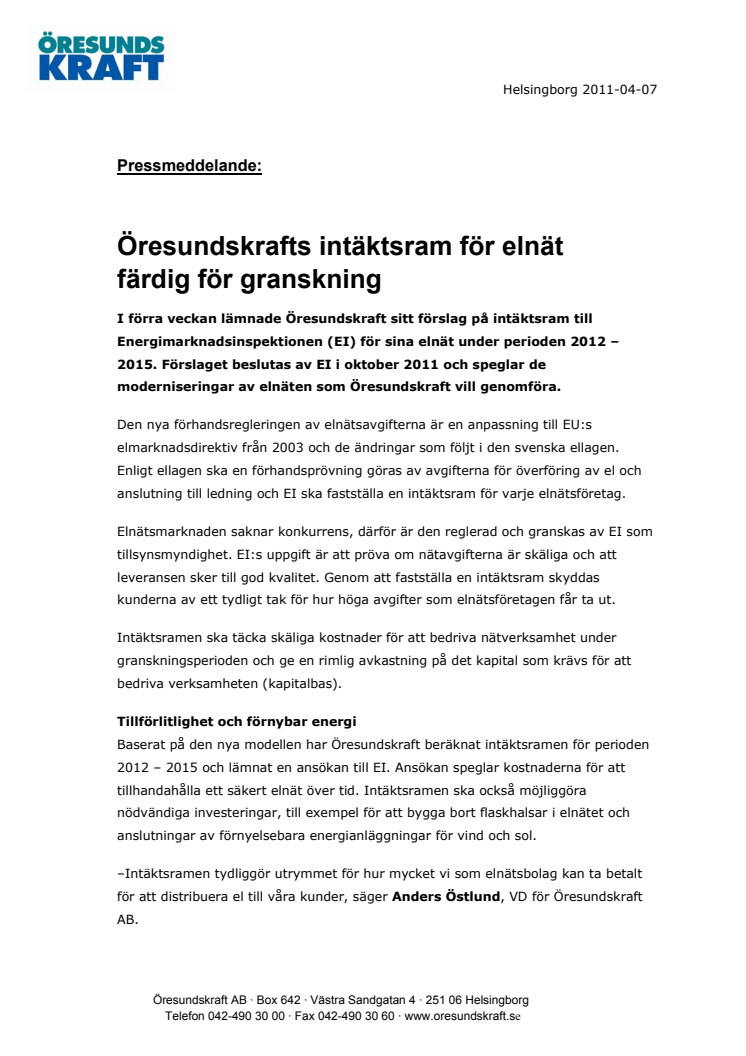 Baserat på den nya modellen har Öresundskraft beräknat intäktsramen för perioden 2012 – 2015 och lämnat en ansökan till EI. Ansökan speglar kostnaderna för att tillhandahålla ett säkert elnät över tid. Intäktsramen ska också möjliggöra nödvändiga investeringar, till exempel för att bygga bort flaskhalsar i elnätet och anslutningar av förnyelsebara energianläggningar för vind och sol.