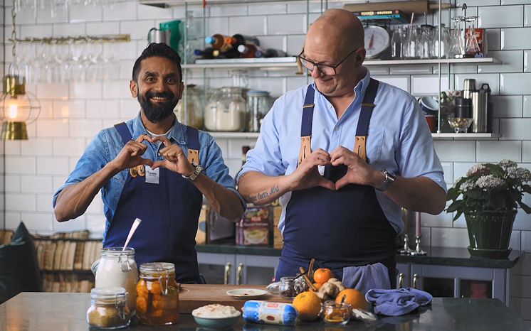 - Vi har gjort ett helt nytt grepp, både för branschen och för Orkla. Tidigare har man valt att göra en produktkatalog som säljarna har jobbat med. Det känns som man mest bläddrat lite i den och sedan slängt den, så nu har vi digitaliserat konceptet och tagit fram en tvåsidig affisch. På den ena sidan finns all relevant produktinformation medan andra sidan har olika julbordssektioner eller serveringar med QR-koder. När man skannar koden kommer det upp olika filmer där jag och Johan visar recept och tips med mera. Vi vill helt enkelt fånga intresset med något annat än en traditionell katalog.