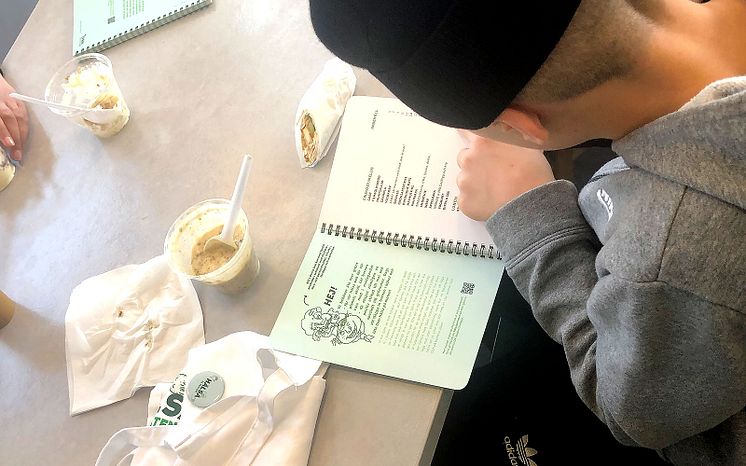 Elev som bläddrar i kokboken "Hälsa på maten".