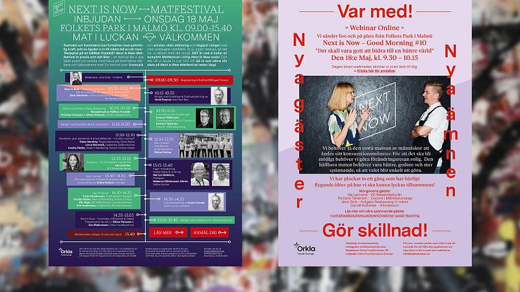 Sedan 2019 har Orkla FoodSolutions drivit frågan om en hållbar och hälsosam framtid under plattformen Next is Now. Genom att bjuda in oberoende forskare och experter till offentliga samtal har man sökt efter problemen och börjat ta action på lösningar.
