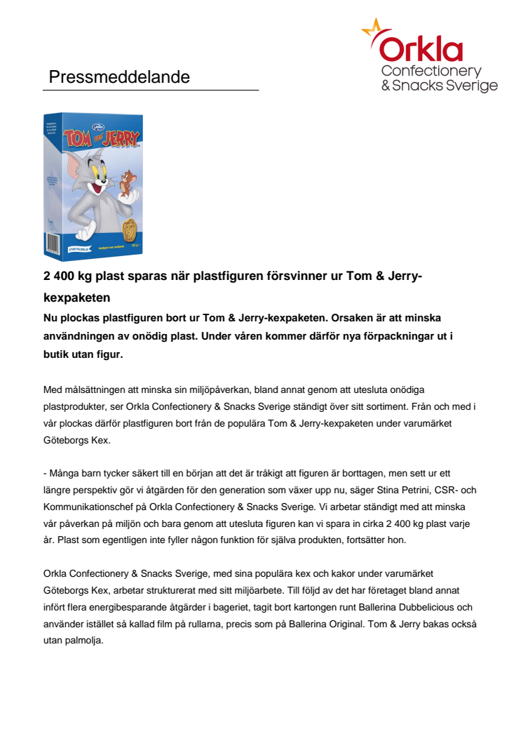 2 400 kg plast sparas när plastfiguren försvinner ur Tom & Jerry-kexpaketen