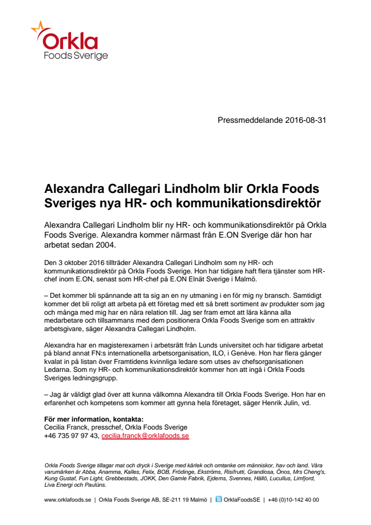 Alexandra Callegari Lindholm blir ny HR- och kommunikationsdirektör på Orkla Foods Sverige. Alexandra kommer närmast från E.ON Sverige där hon har arbetat sedan 2004.