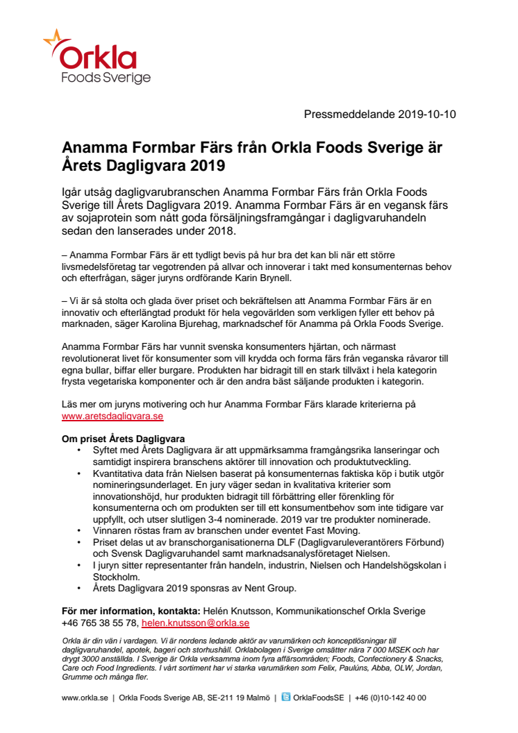 Igår utsåg dagligvarubranschen Anamma Formbar Färs från Orkla Foods Sverige till Årets Dagligvara 2019. Anamma Formbar Färs är en vegansk färs av sojaprotein som nått goda försäljningsframgångar i dagligvaruhandeln sedan den lanserades under 2018.