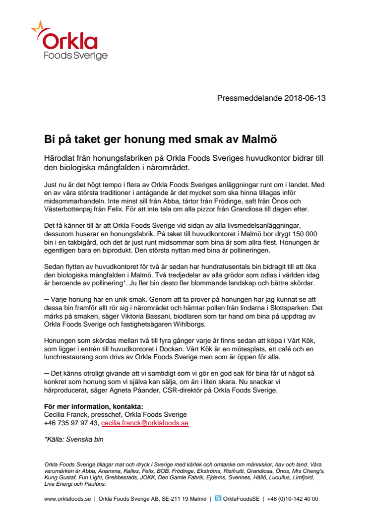 Härodlat från honungsfabriken på Orkla Foods Sveriges huvudkontor bidrar till den biologiska mångfalden i närområdet.